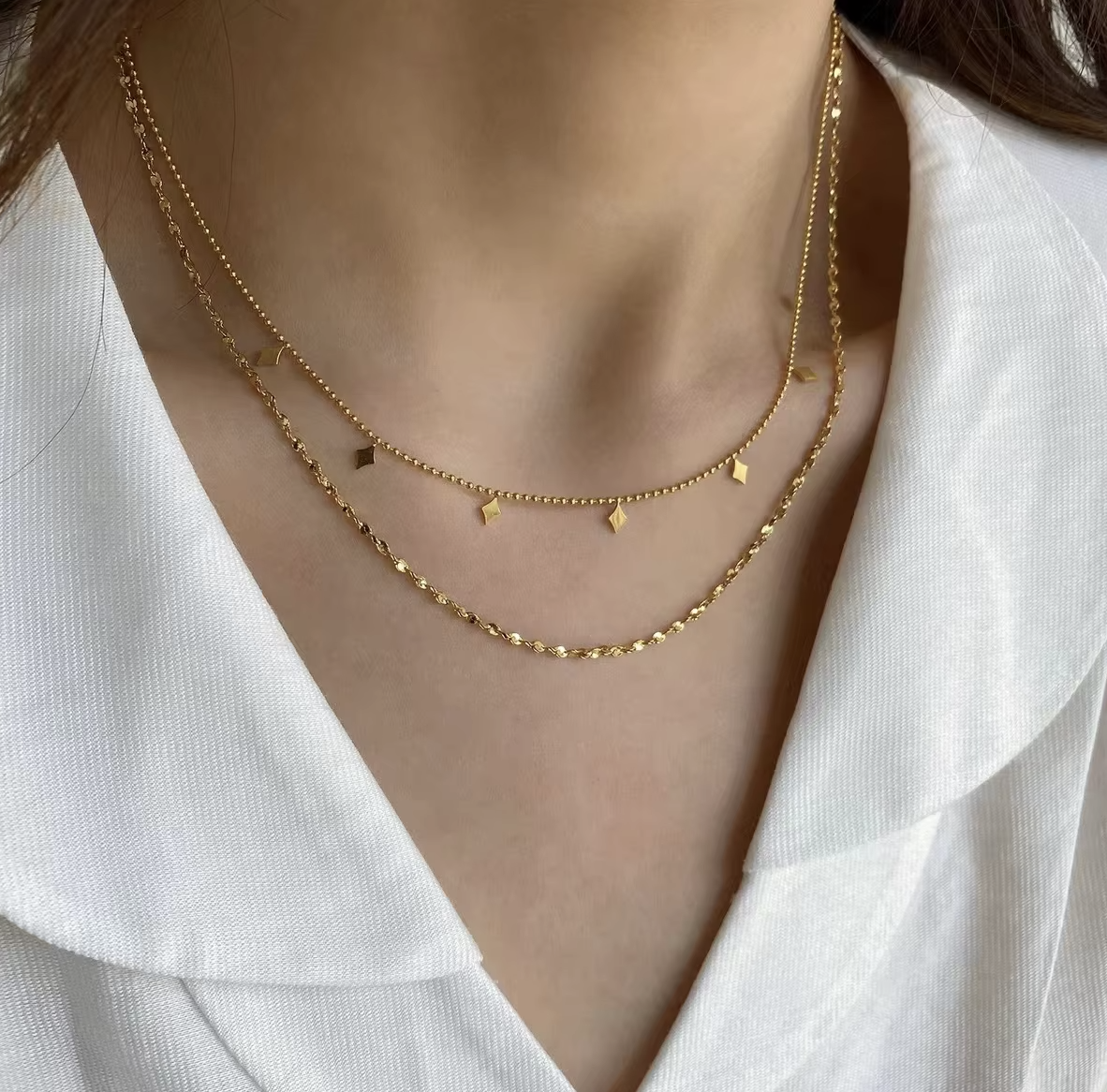 Deux chaînes, deux niveaux, une seule énergie. Ce collier joue la carte de la subtilité avec ses pampilles géométriques qui captent la lumière au moindre mouvement. Une pièce pensée pour les femmes qui avancent avec calme et assurance, sans jamais s’excuser d’exister.
